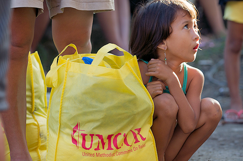 Donna-Grace Orbong, 5, sits with her family's food bag following a distribution by the United Methodist Committee on Relief for survivors of Typhoon Haiyan in Tacloban, Philippines. ~ UMCOR photo